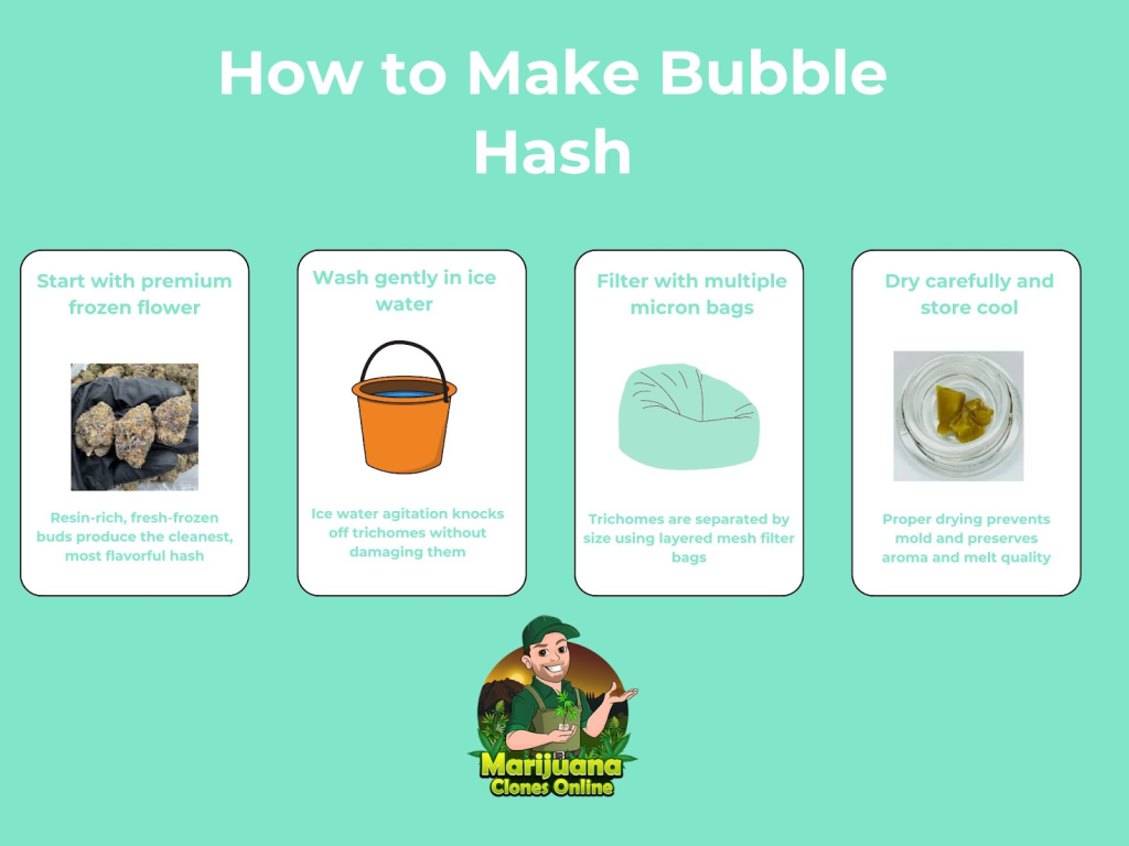 Quality starts long before the wash. The best bubble hash comes from resin-heavy strains with the right trichome structure, traits found in phenohunted genetics. Growers using cannabis clones from Marijuana Clones Online already have that head start. Our mother plants were chosen for their ability to yield clean, potent hash across multiple washes.