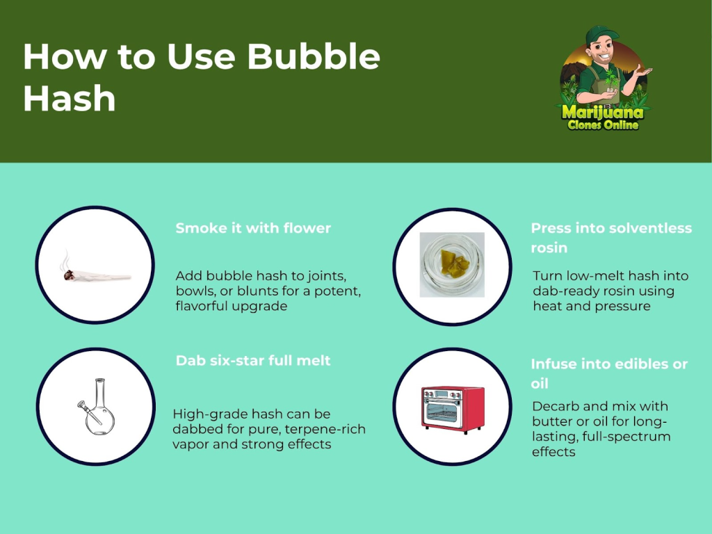 Bubble hash works well in edibles, especially when decarboxylated first. Once activated, it can be infused into oils, butter, or MCT oil. This method is popular with medical users who want long-lasting effects without smoking.