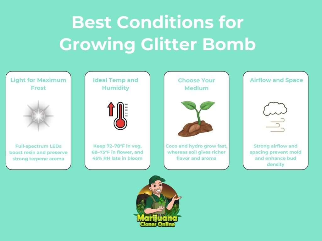 Glitter Bomb performs best in environments designed to support both visual appeal and resin production. With THC levels reaching 31 percent in verified cuts, this strain responds well to attention and precision. Compact structure, dense buds, and trichome saturation all depend on creating the right conditions from start to finish.