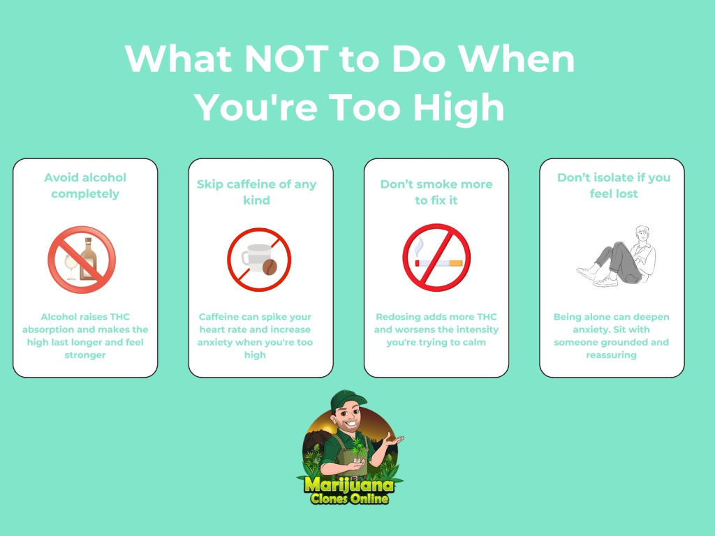 Alcohol and THC do not play well together. Alcohol increases THC absorption in your bloodstream, which can make the high stronger and longer. If you’re already overwhelmed, drinking will only add to the confusion and discomfort.