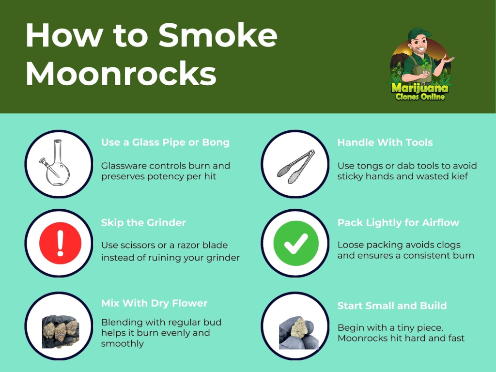 - Use Tongs or Dab Tools When Handling. Touching Moonrocks with bare hands leads to sticky fingers and lost kief. Use metal tools or silicone-tipped tongs to preserve the outer coating and keep the oil layer intact.