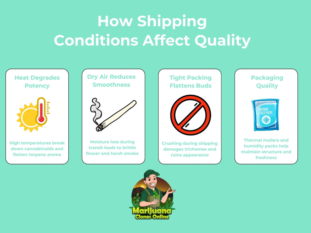Proper packaging helps buffer against outdoor conditions. High-quality mailers with thermal liners and protective padding help preserve flower integrity.